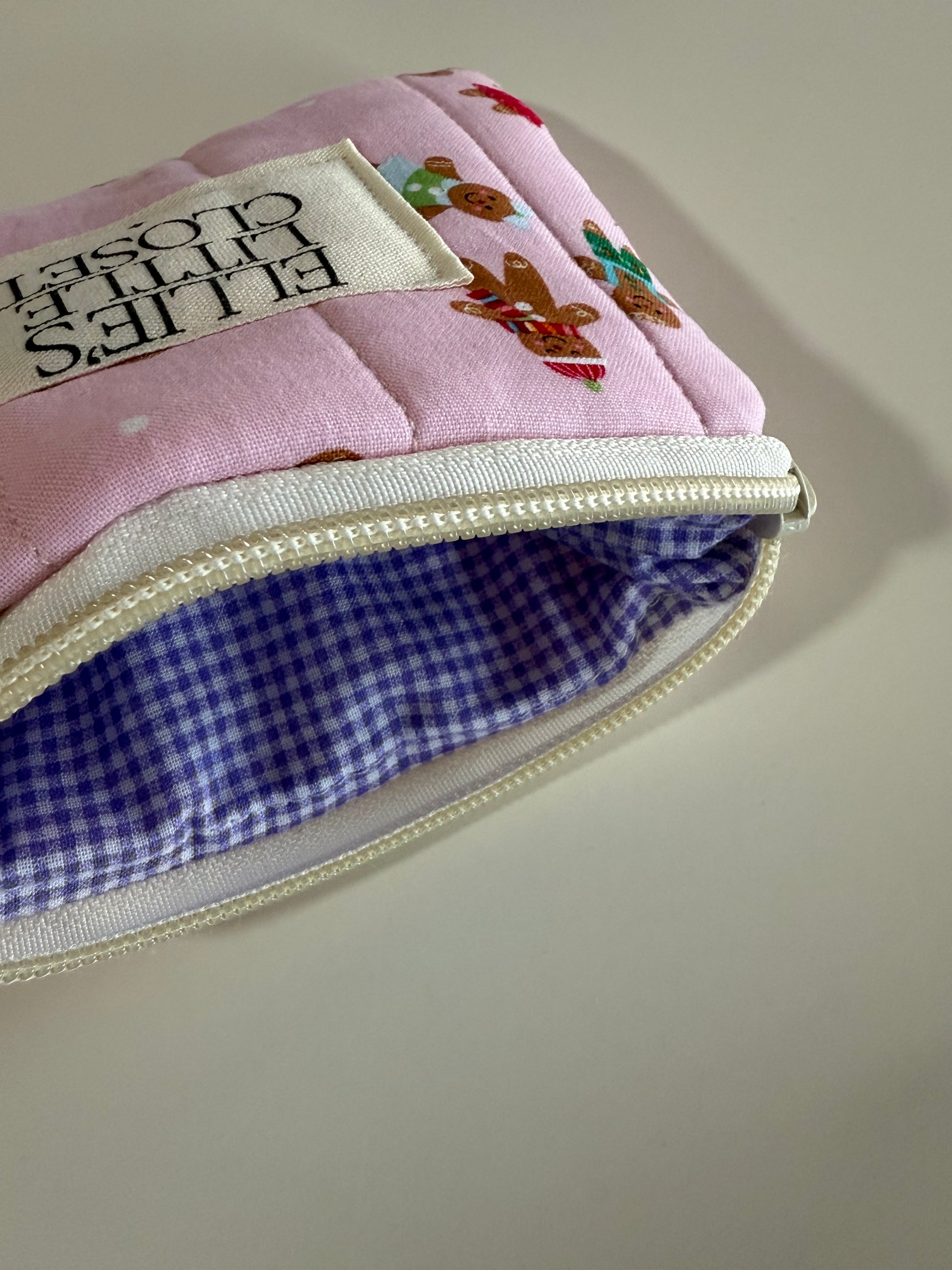 Get ready for the holidays with our adorable gingerbread print zippered pouch! This quilted little bag features a charming pink background dotted with festive gingerbread people dressed in colorful icing outfits. Perfect for storing coins, keys, or tiny treasures, this pouch from Ellie's Little Closet adds a playful touch of seasonal cheer to your collection.