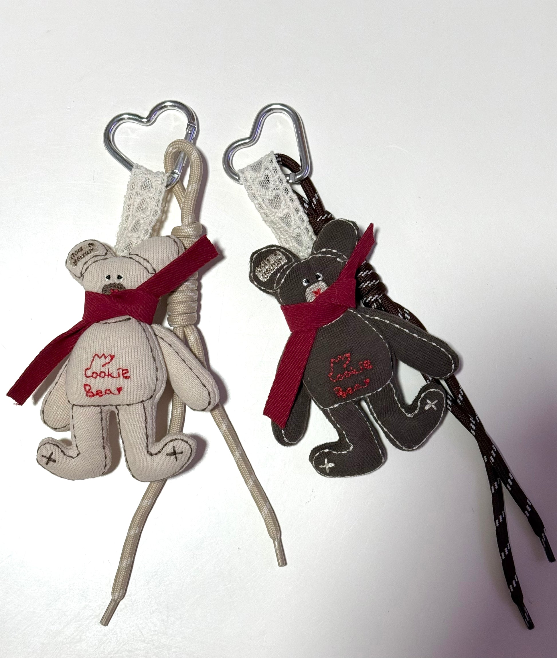 Meet our charming "My Cookie Bear" keychains, the sweetest accessory for your bags, keys, or backpacks. These adorable plush bears come in both cream and dark brown fabric, each wearing a cozy red scarf and sporting embroidered "My Cookie Bear" text on their tummies. They are attached to a fun lace and shoelace-style knot, secured by a large, convenient heart-shaped carabiner clip.